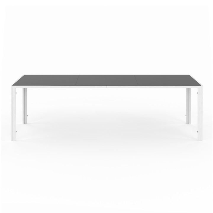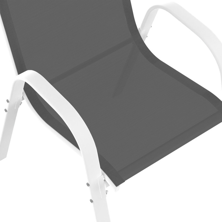Set di mobili da giardino bianchi e grigi con sedie impilabili